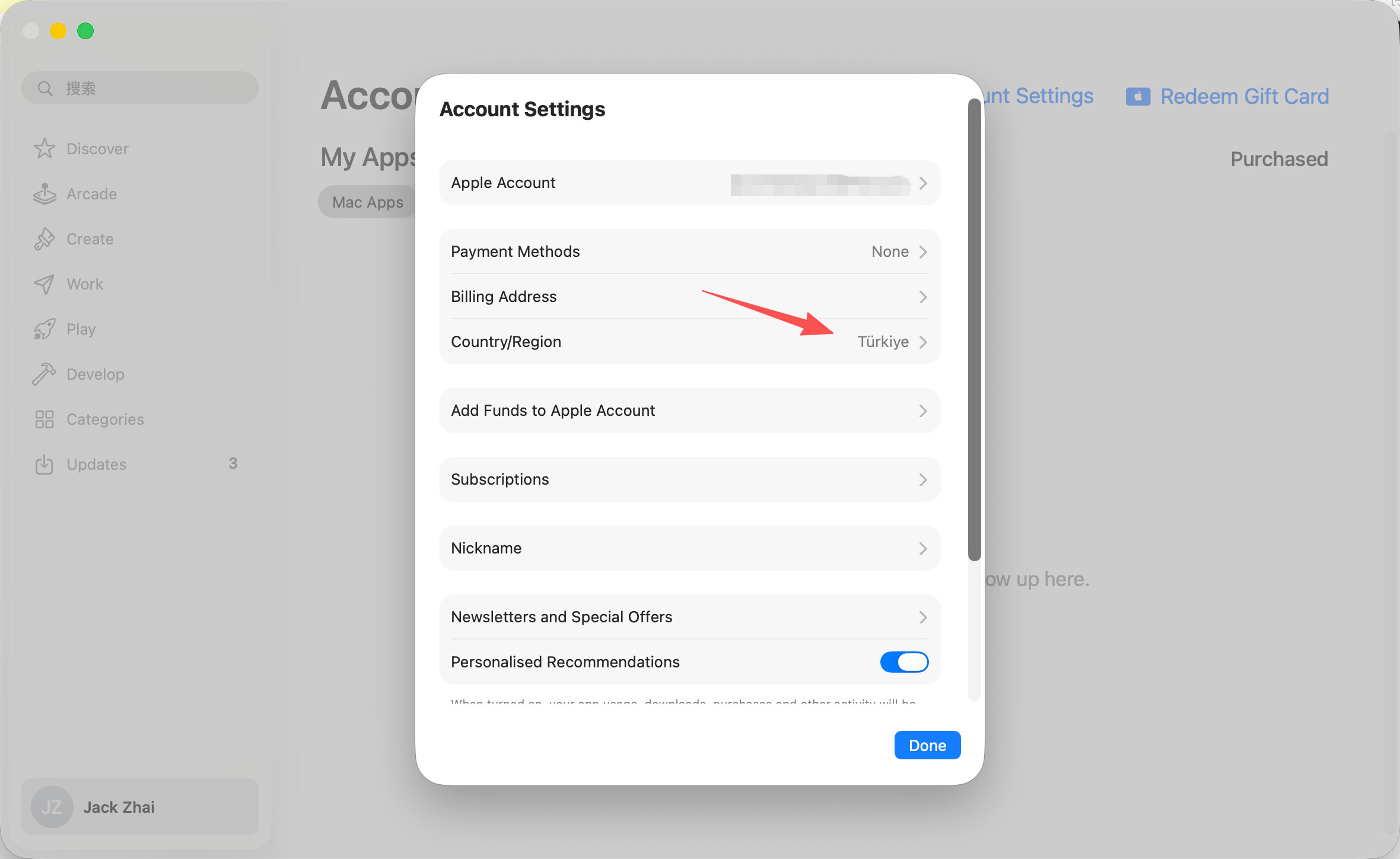 完成 Scheme 切换后,再回到 App Store 登录刚才已经转成土区的 Apple ID。登录后进入账户设置,确认 Country/Region 显示为 Türkiye / Turkey。