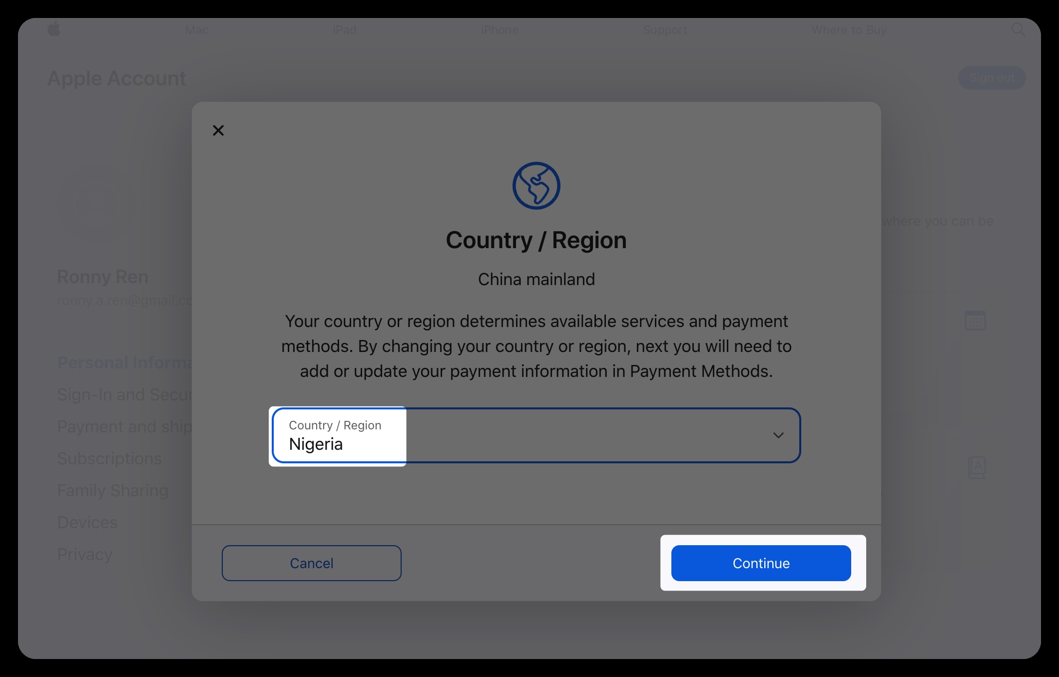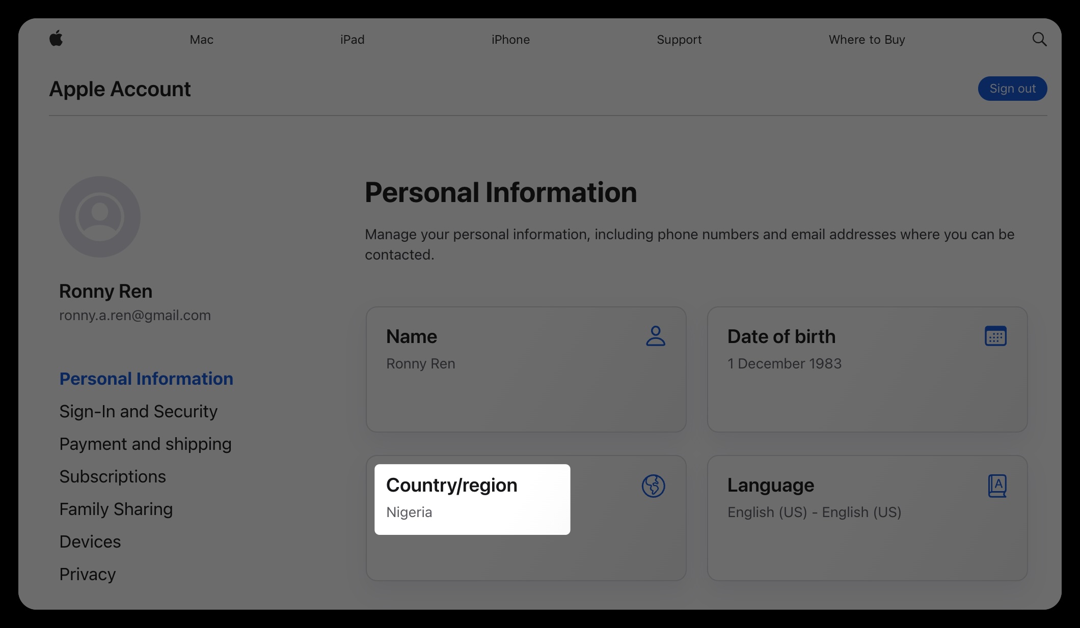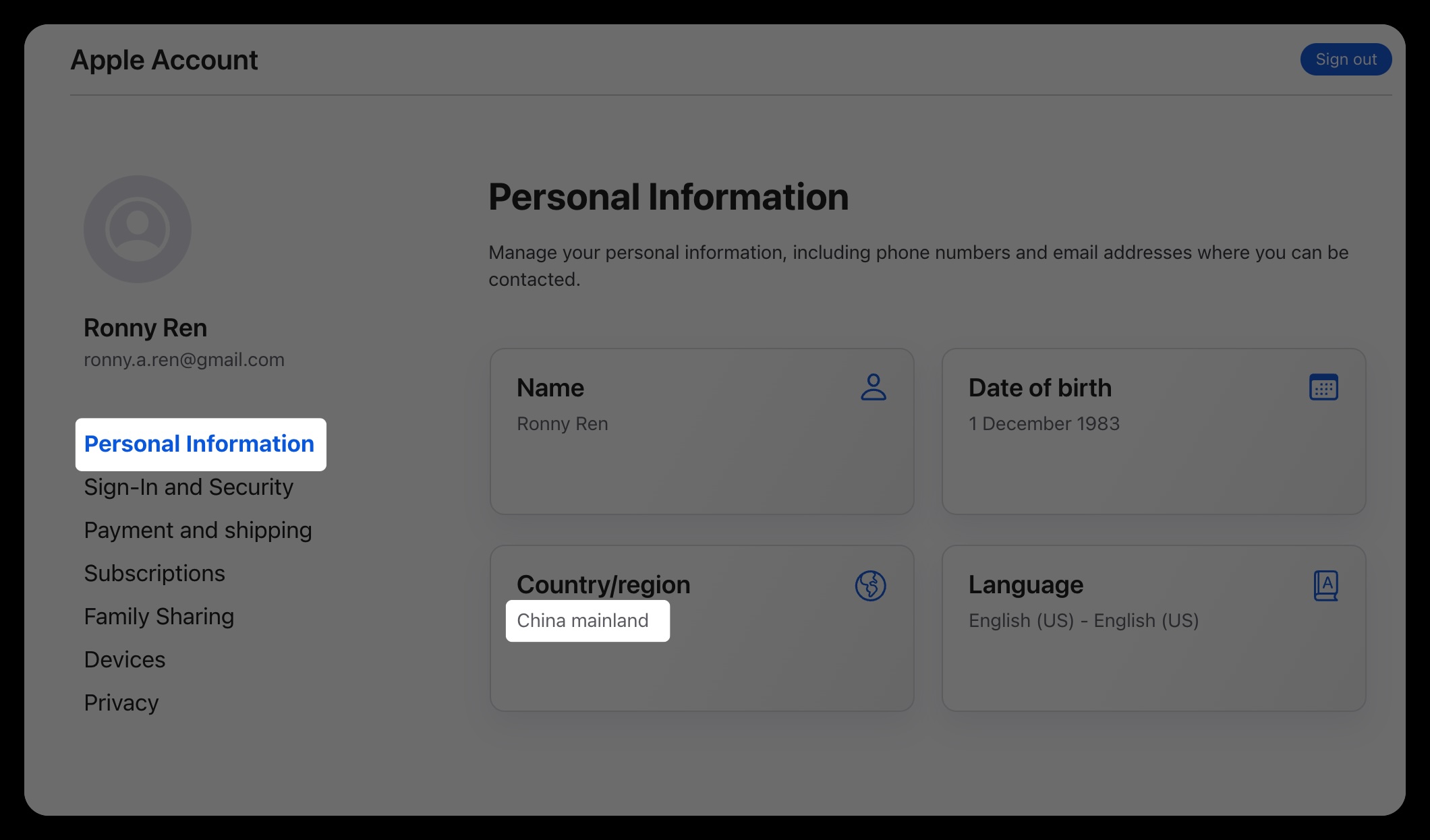 登录账号后,进入 Personal Information / 个人信息,找到 Country/Region / 国家或地区。