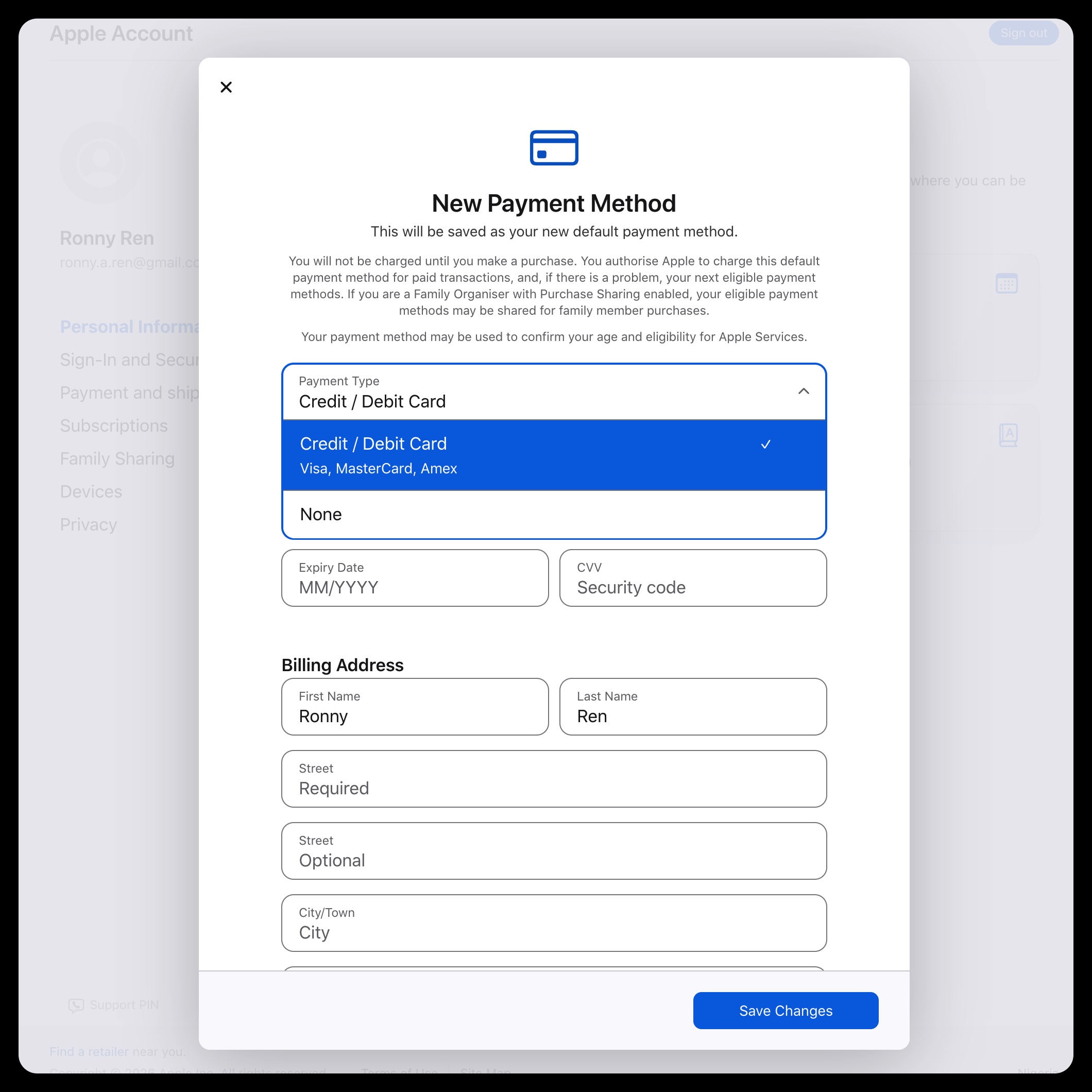 然后回到 Apple 的付款方式页面,把付款方式选为 None / 无,再把刚才生成的土耳其地址填进去。