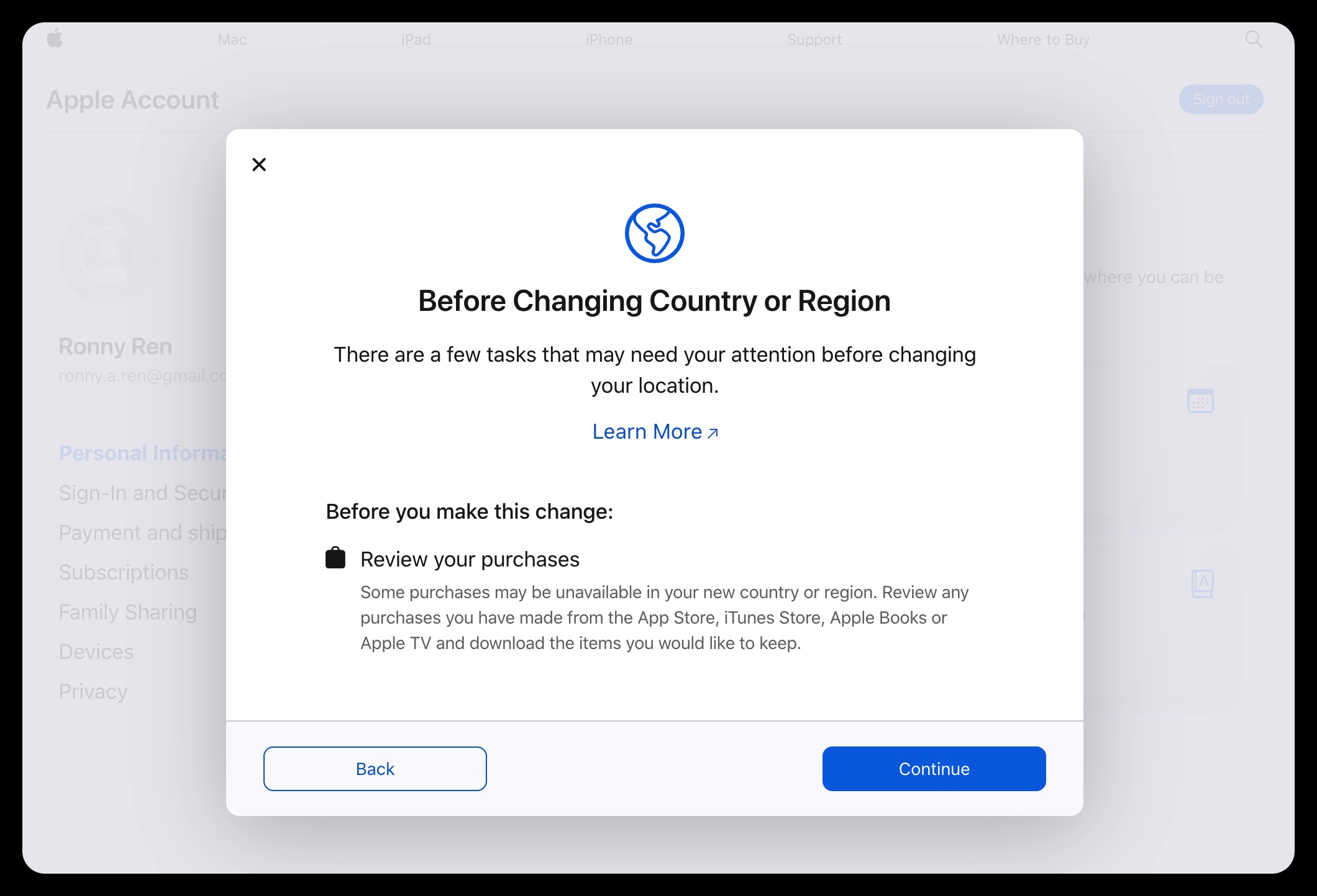- 是否在网页端完整走了 Country/Region 修改流程。