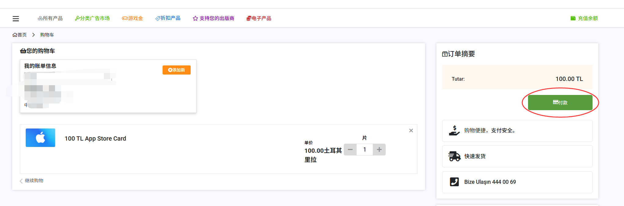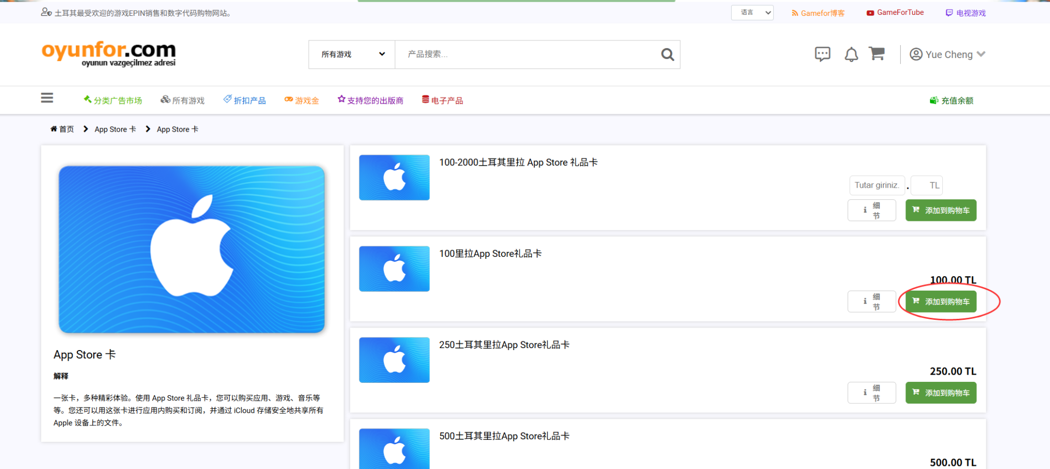 这里建议再次确认金额和单位是 TL / 土耳其里拉,不要买错其他地区的礼品卡。