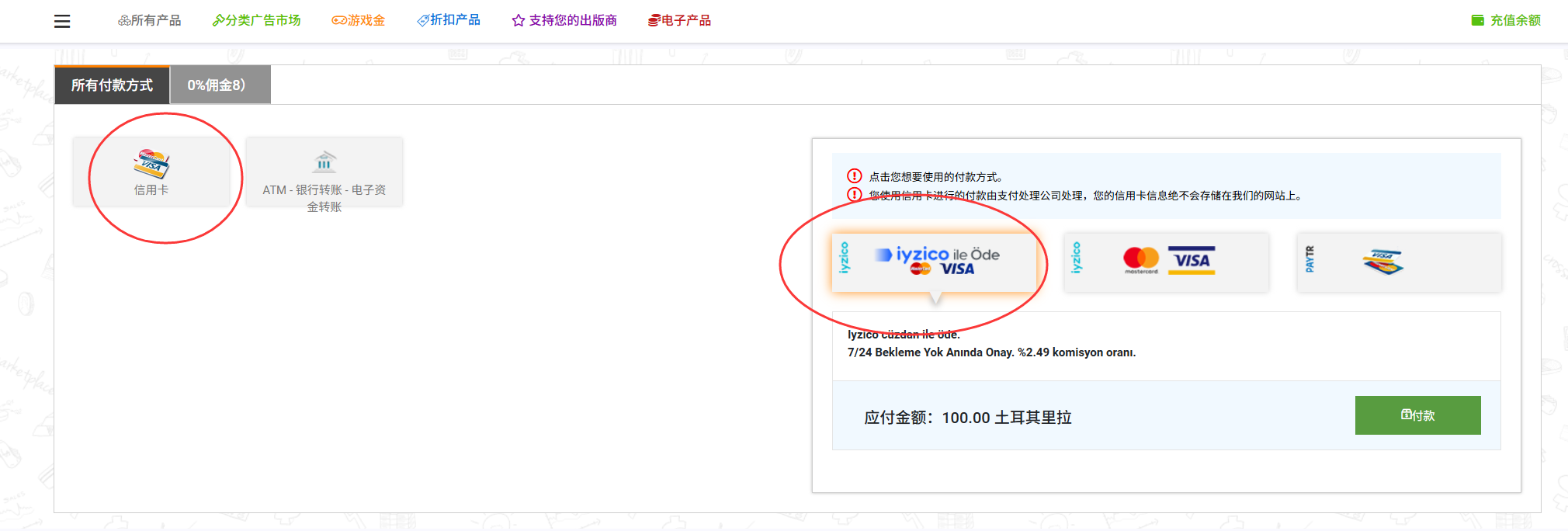 右侧支付通道里,优先选择 Iyzico ile Öde。当前页面里这个通道显示约 2.49% 手续费,是几个选项里较低的,并且现在可以尝试使用银联卡。部分旧教程说 Iyzico 不支持银联,这个信息已经过时;实际以当前支付页和发卡行结果为准。