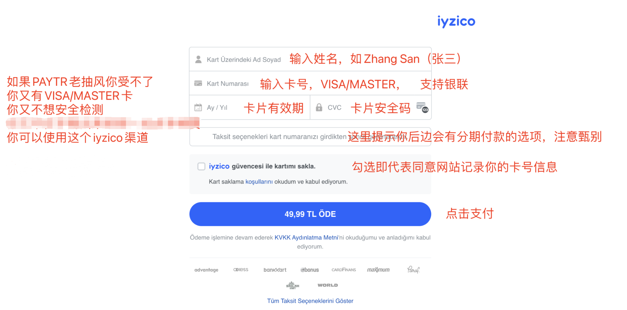 Kart Üzerindeki Ad Soyad:填写卡面姓名,例如Zhang San。Kart Numarası:填写银行卡号。Iyzico 可尝试 Visa、MasterCard,也支持银联卡。Ay / Yıl:填写卡片有效期。CVC:填写卡片安全码。- 页面里的“保存银行卡”选项不建议勾选,勾选代表同意网站记录你的卡号信息。