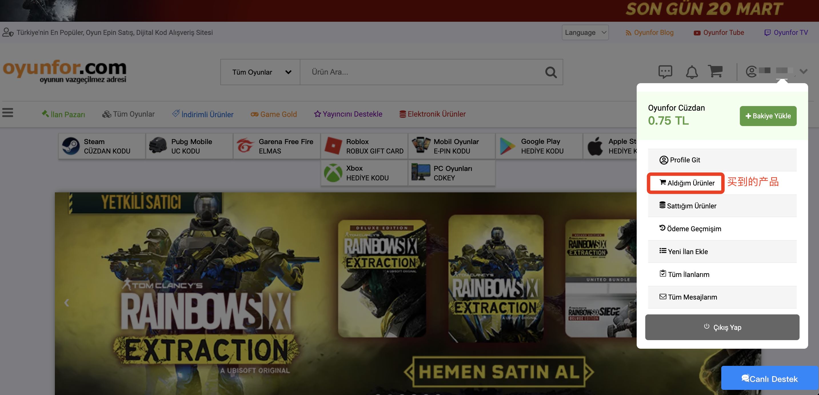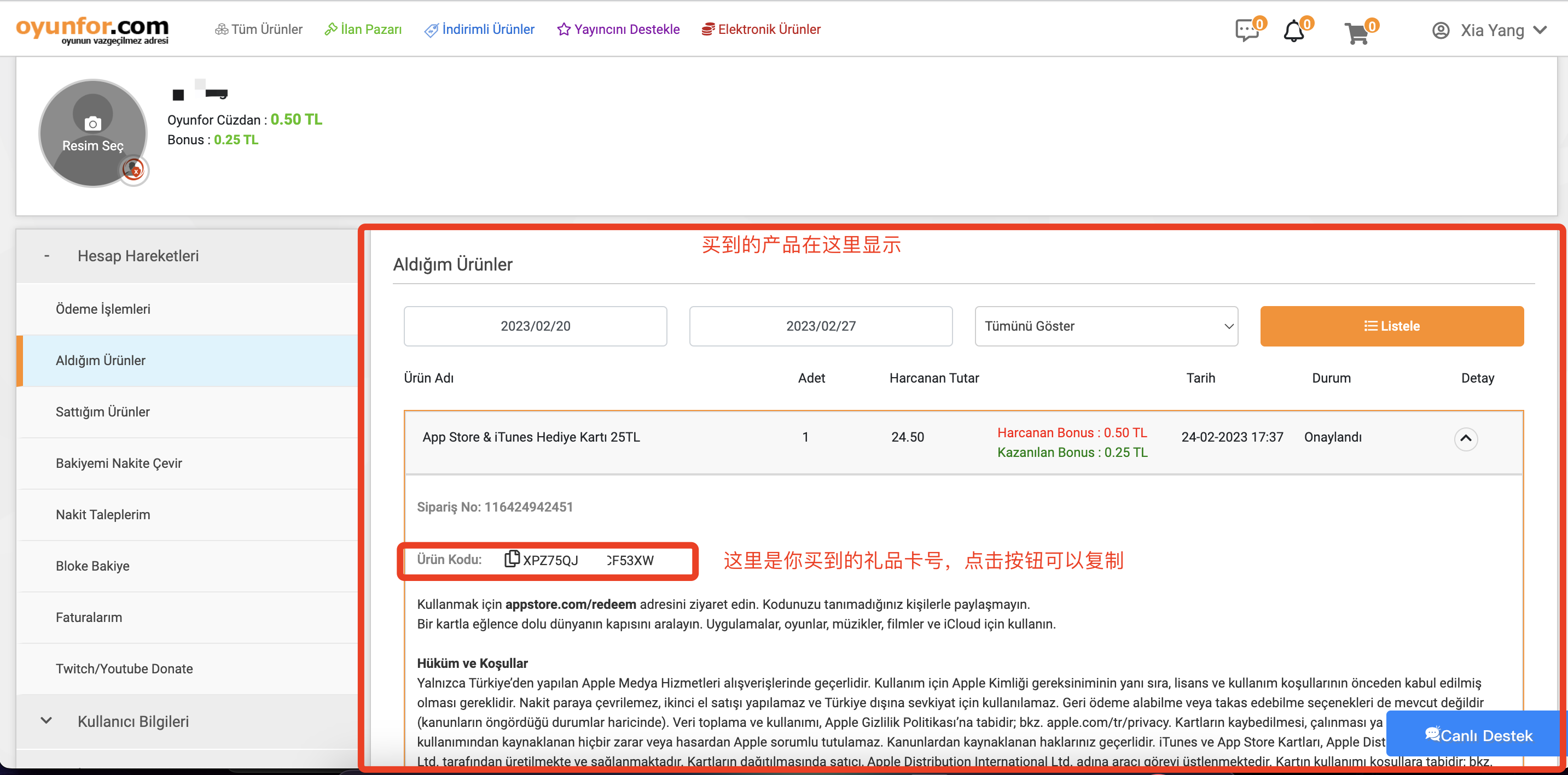付款成功后,进入右上角头像菜单,找到 Aldığım Ürünler / 我购买的产品。
