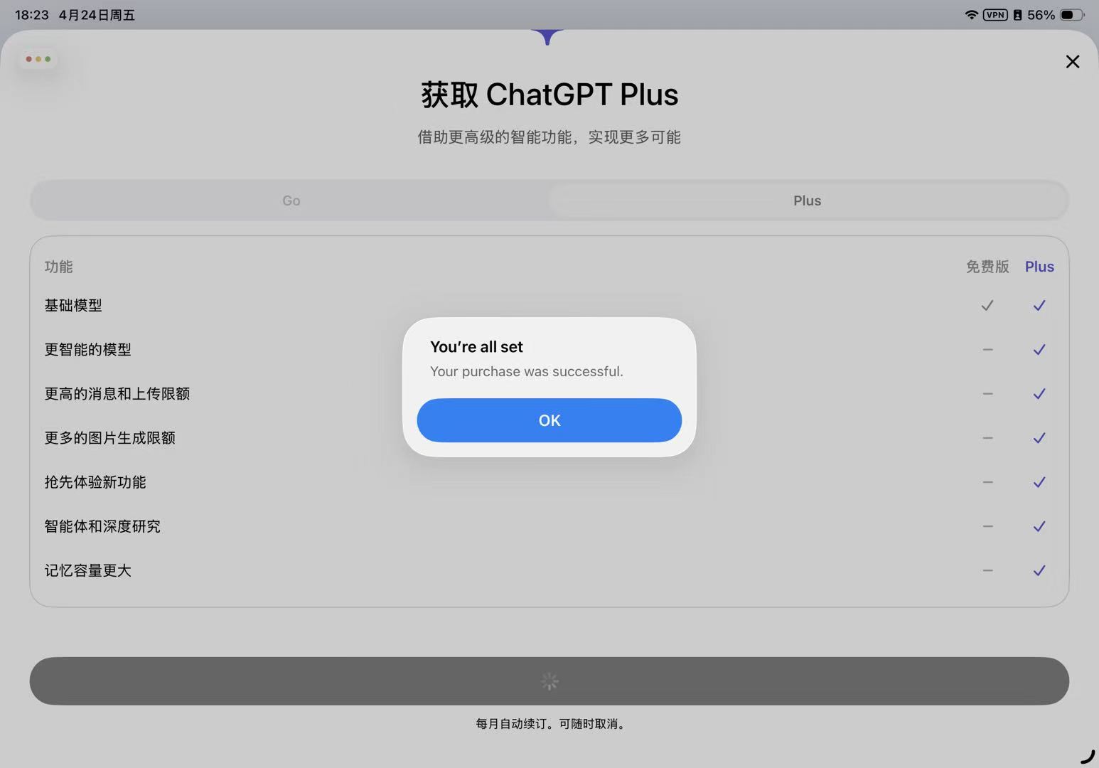 - 等一段时间后,用 iPhone 或 iPad 在 ChatGPT App 里完成 Plus 订阅。